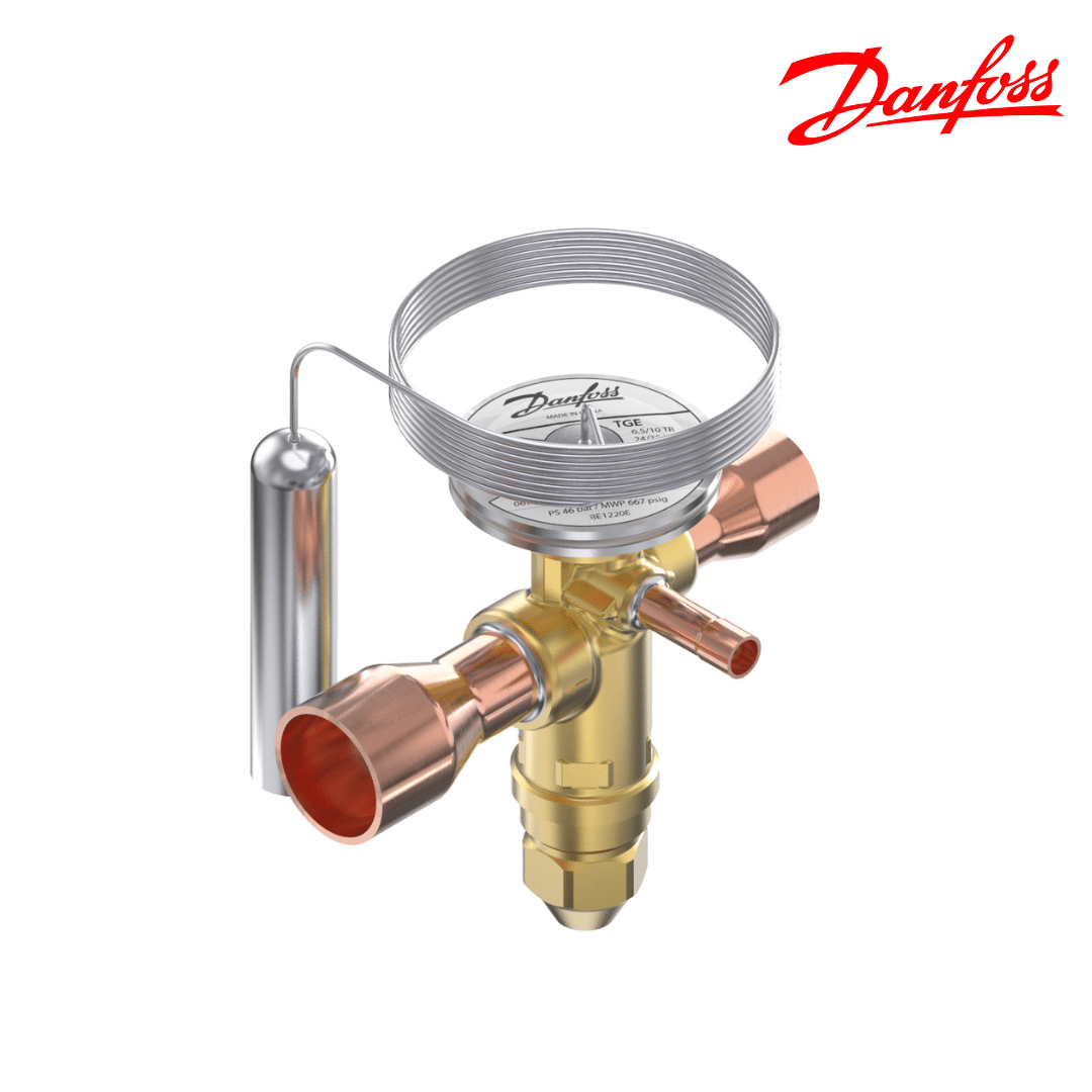 Válvula de expansión DANFOSS TGEL9, diseñada para sistemas de aire acondicionado y refrigeración comercial que operan con refrigerante R410A. Regula de forma precisa el flujo de refrigerante hacia el evaporador, asegurando máximo rendimiento, estabilidad térmica y protección del compresor.