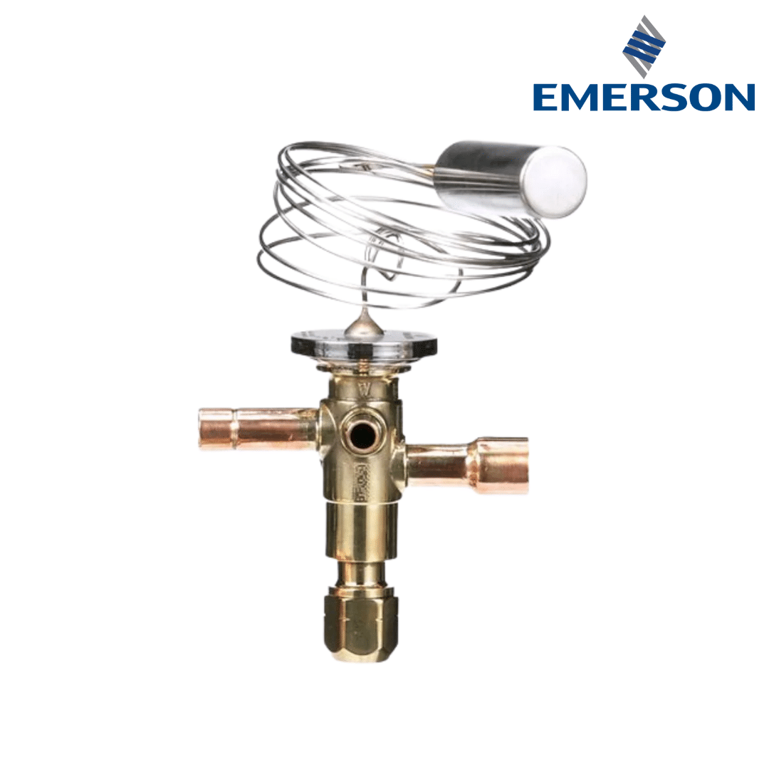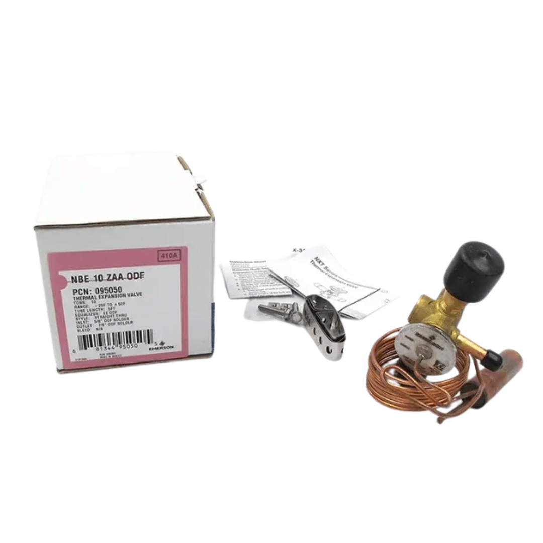 Válvula de expansión termostática EMERSON NBE 10 ZAA, diseñada para sistemas de aire acondicionado y refrigeración que operan con refrigerante R410A. Regula de manera precisa el flujo de refrigerante hacia el evaporador, garantizando máxima eficiencia, estabilidad térmica y protección del compresor.