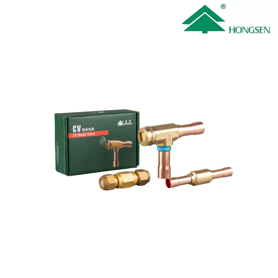 Válvula de retención (check) modelo CV-10GT de Hongsen, diseñada para permitir el flujo del refrigerante en un solo sentido y evitar el retorno indeseado dentro del sistema. Fabricada para aplicaciones de refrigeración y aire acondicionado, garantiza un funcionamiento seguro, eficiente y confiable.