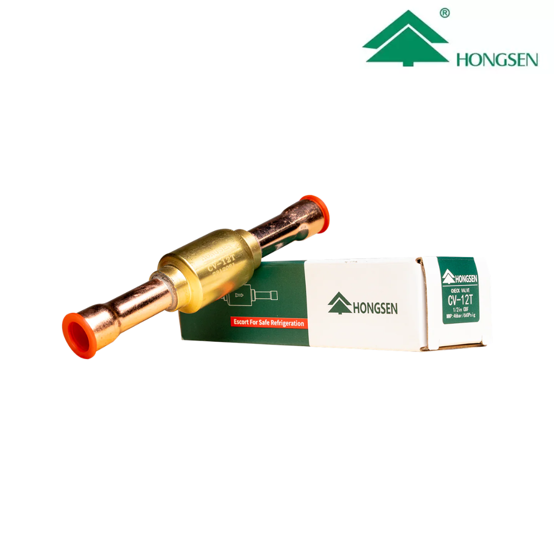 Válvula de retención (check) modelo CV-12T de Hongsen, diseñada para permitir el flujo del refrigerante en un solo sentido y evitar el retorno no deseado dentro del sistema. Ideal para sistemas de refrigeración y aire acondicionado, contribuye a la protección del compresor y al correcto funcionamiento del sistema.