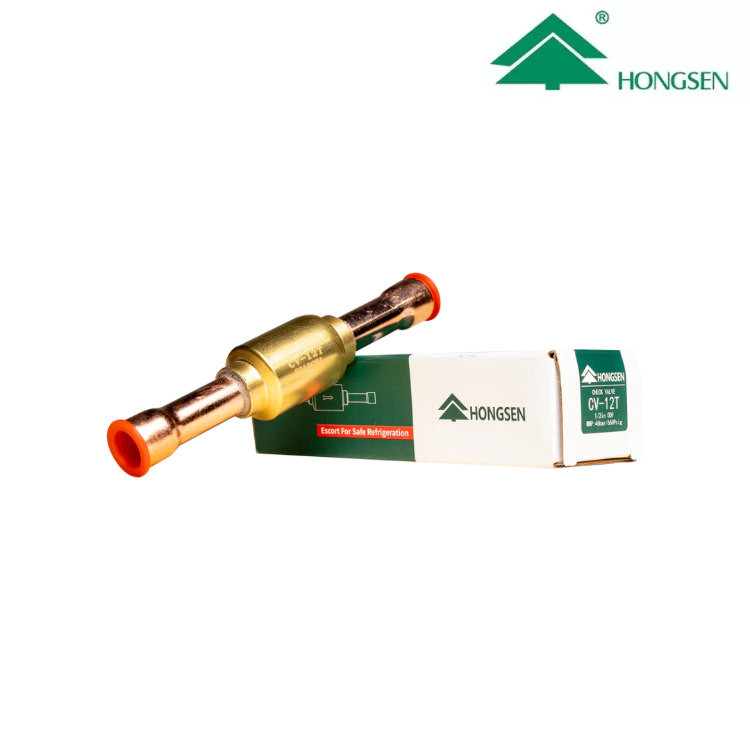 Válvula de retención (check) modelo CV-16T de Hongsen, diseñada para permitir el flujo del refrigerante en un solo sentido y evitar el retorno no deseado dentro del sistema. Recomendada para sistemas de refrigeración y aire acondicionado, ayuda a proteger el compresor y a mantener un funcionamiento estable y seguro.