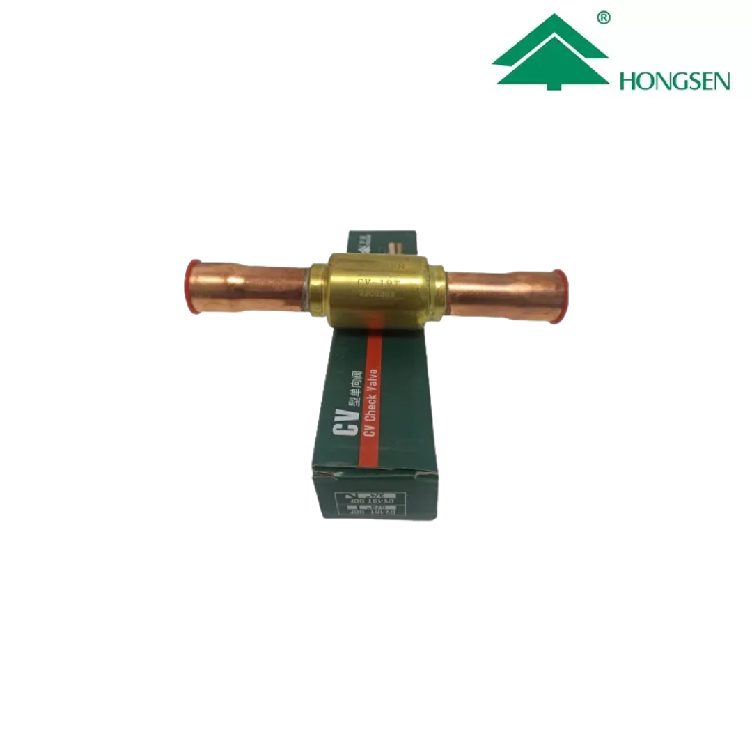 Válvula de retención (check) modelo CV-19T de Hongsen, diseñada para permitir el paso del refrigerante en un solo sentido y evitar el retorno no deseado dentro del sistema. Indicada para aplicaciones de refrigeración y aire acondicionado, ayuda a proteger el compresor y a mantener la estabilidad operativa del sistema.